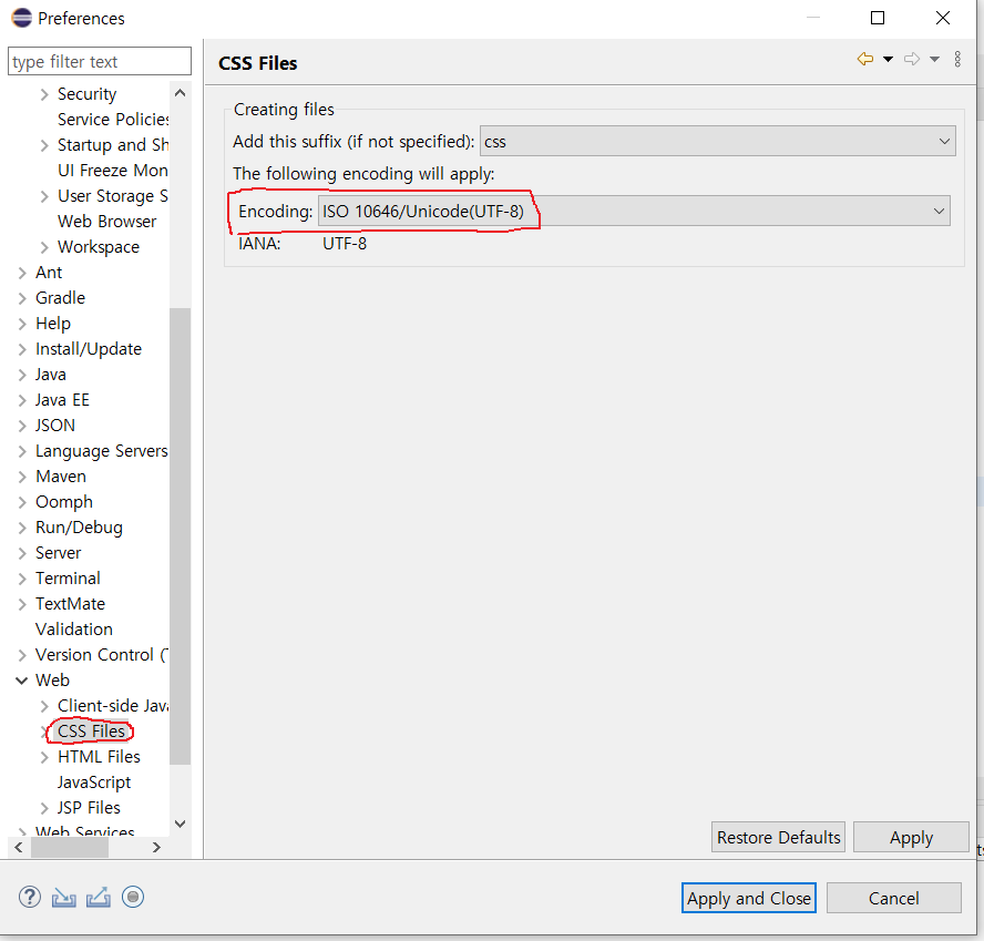 3. Web=>CSS Files의 encoding을 UTF-8로 변경한다