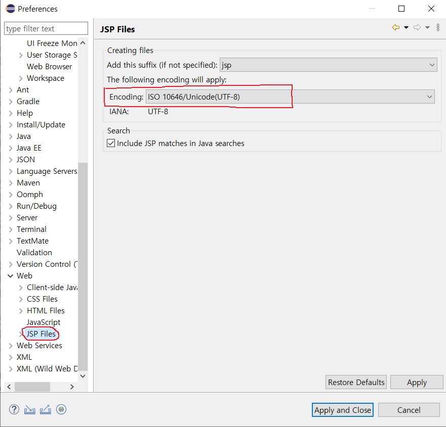 4. Web=>HTML Files의 encoding을 UTF-8로 변경한다