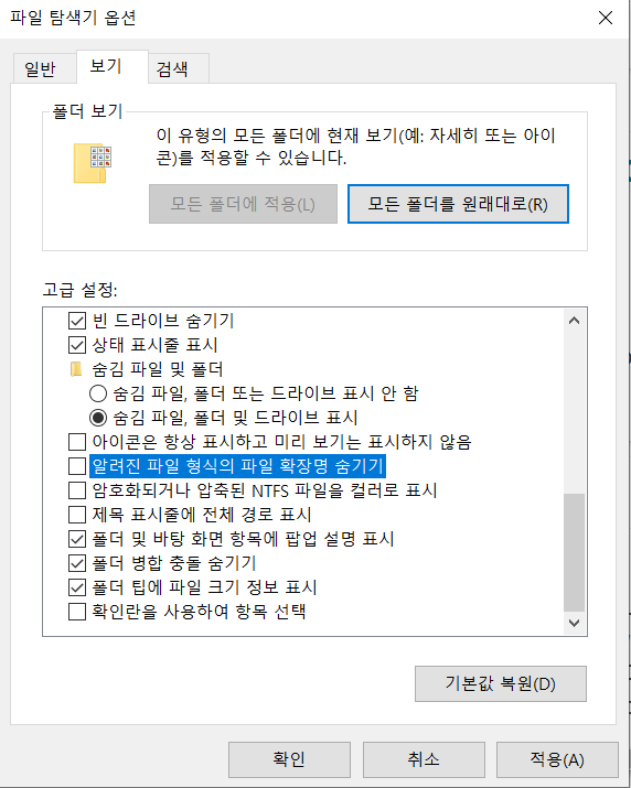 알려진 파일 형식의 파일 확장명 숨기기를 체크 해제한다.