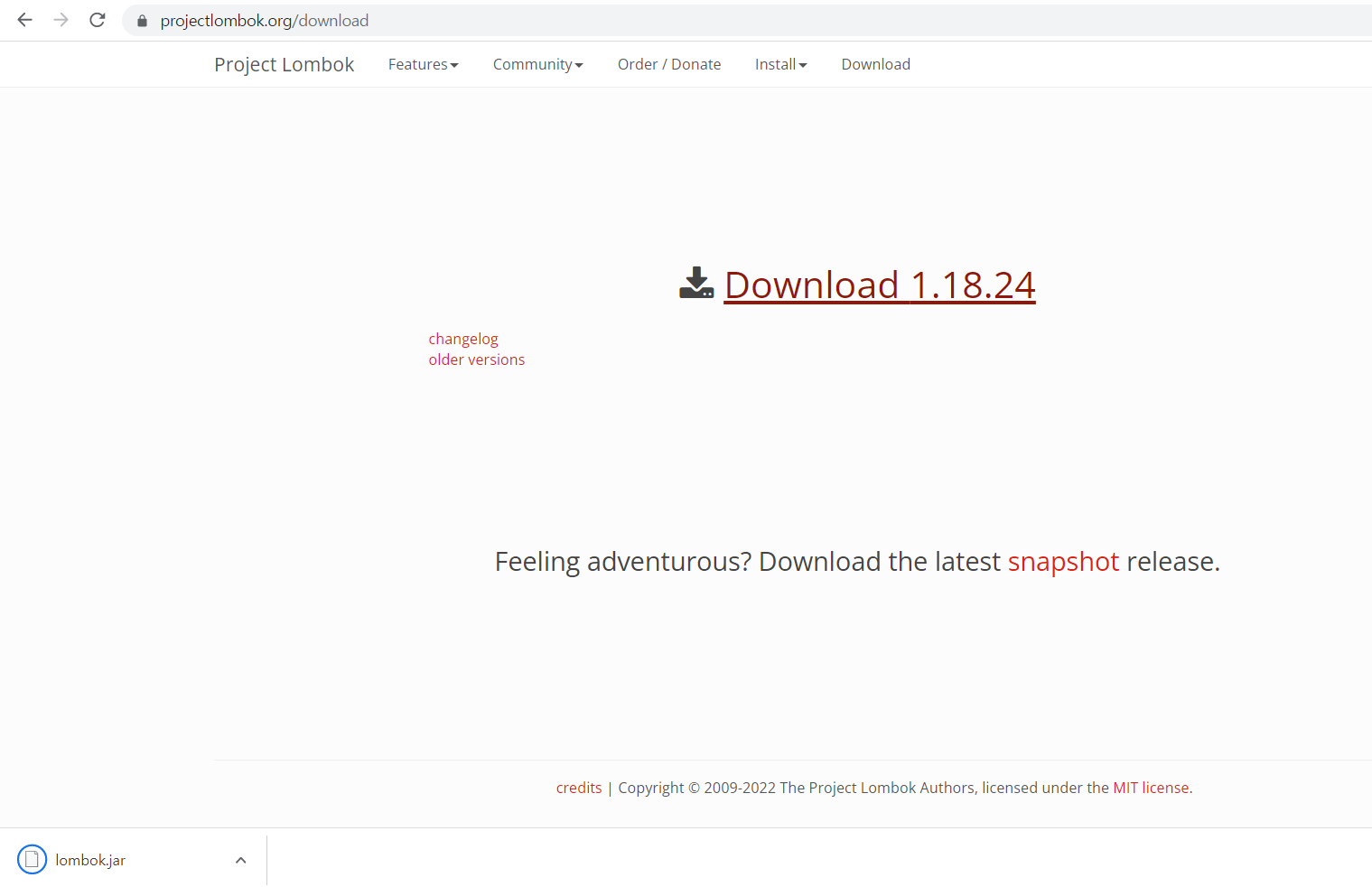 해당 링크로 접속하고 Download를 클릭하여 lombok.jar을 다운한다.